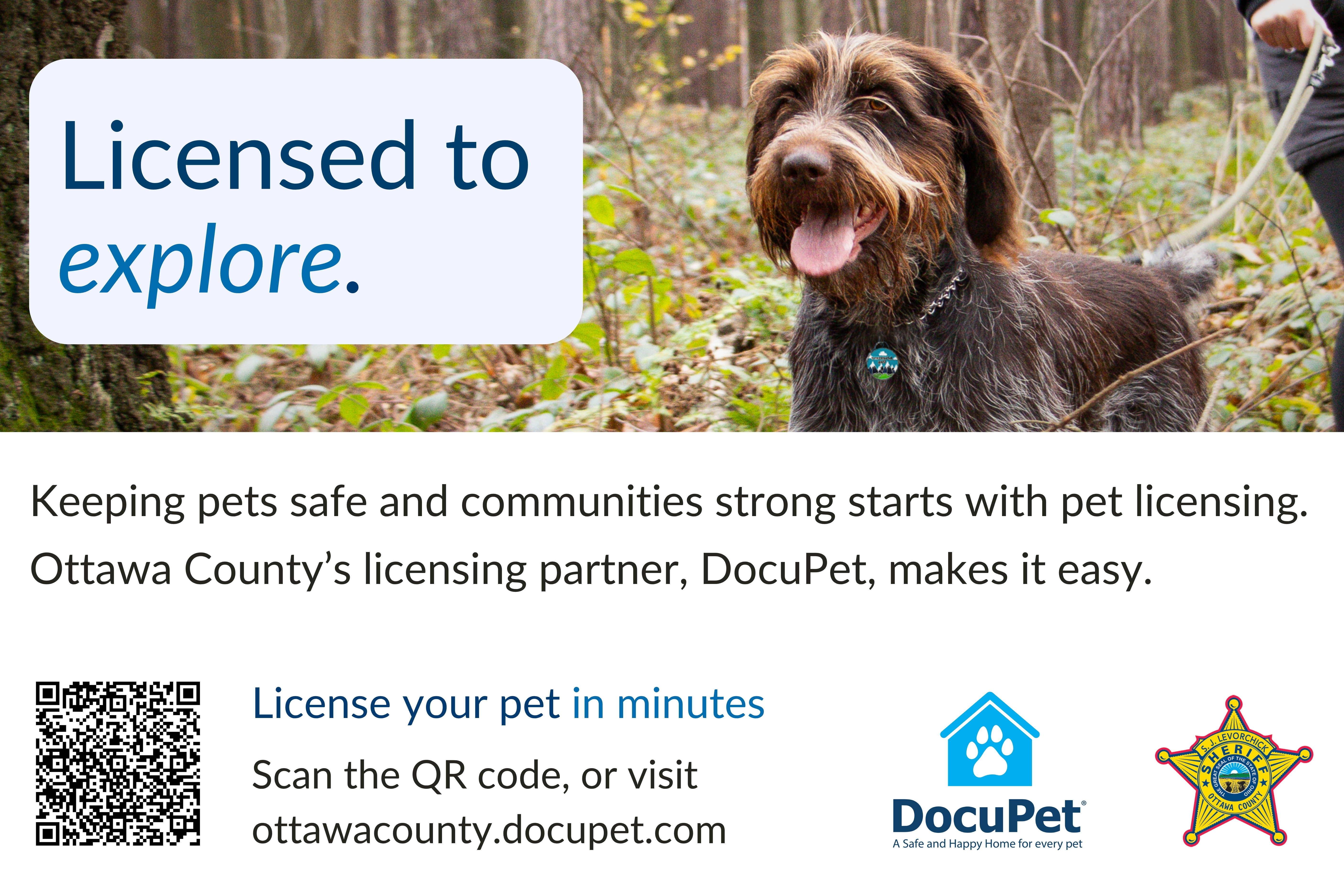Dog Tag Vendor Change 2026 Ottawa County will now be using DocuPet to process and track all Dogs. Dog owner's must now register and pay online through DocuPet. Assistance will be available at the Ottawa County Auditor's Office. All dog tags will be mailed to the owner regardless of where they are purchased. Use the QR code below or visit https://ottawacounty.docupet.com/en_US/